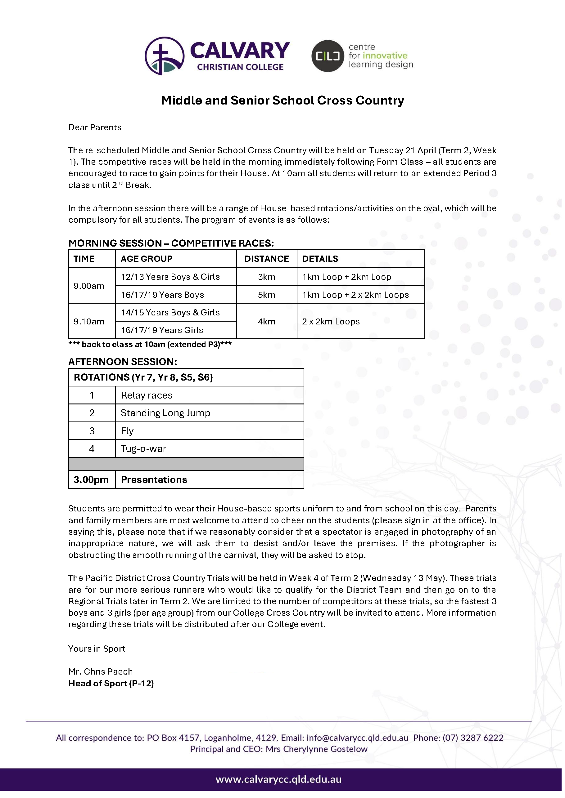 The Junior School and Middle Senior School Cross Country events have been rescheduled to Tuesday 21 April (second day back of Term 2). Further information: MSS Cross Country Letter 2026